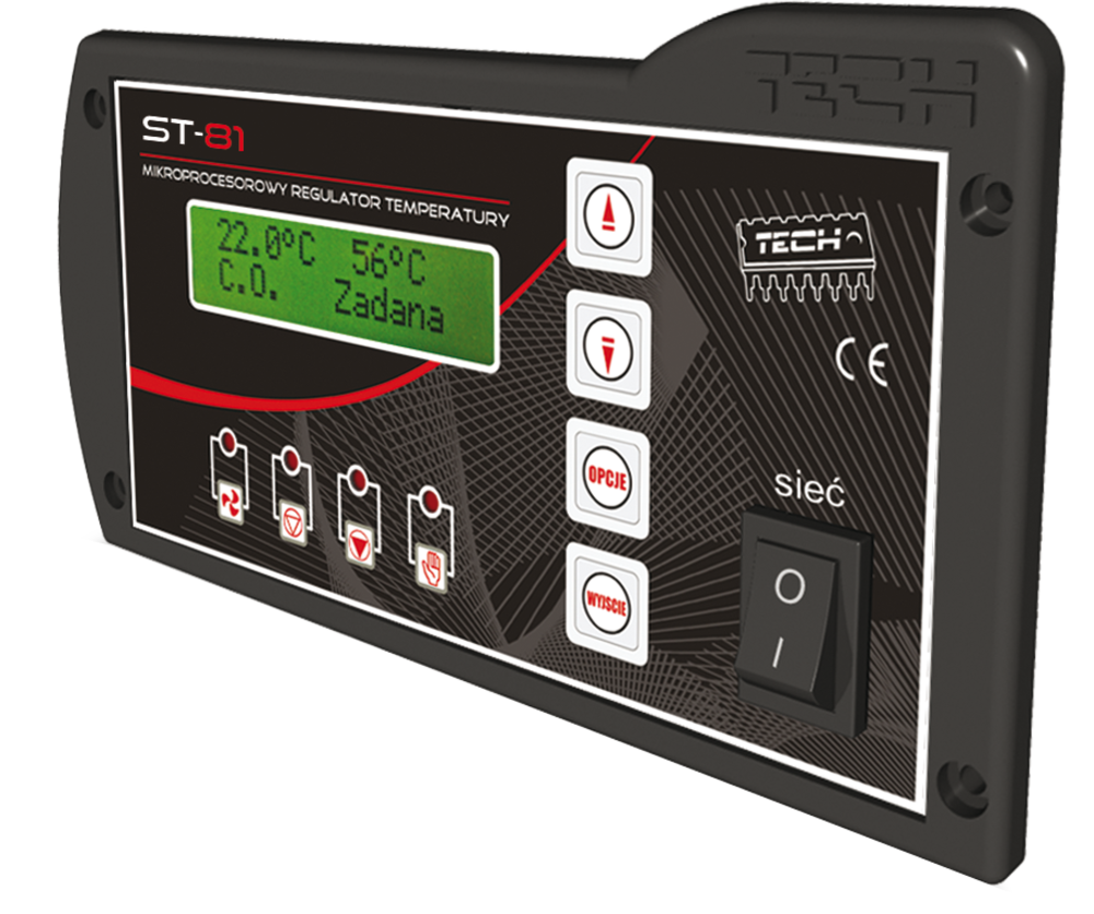 Der Temperatur-Regler EU-81 (ST-81) ist für ZH-Beschickungskessel entwickelt. Er steuert die Heizungs- und Warmwasserpumpe sowie die Zuluft. Zur Auswahl stehen vier Betriebsarten: Heizung, Warmwasser-Priorität, paralleler Betrieb der Pumpen, Sommermodus. Der Gehäuse des Steuergeräts ist für Montage am Kessel konzipiert.