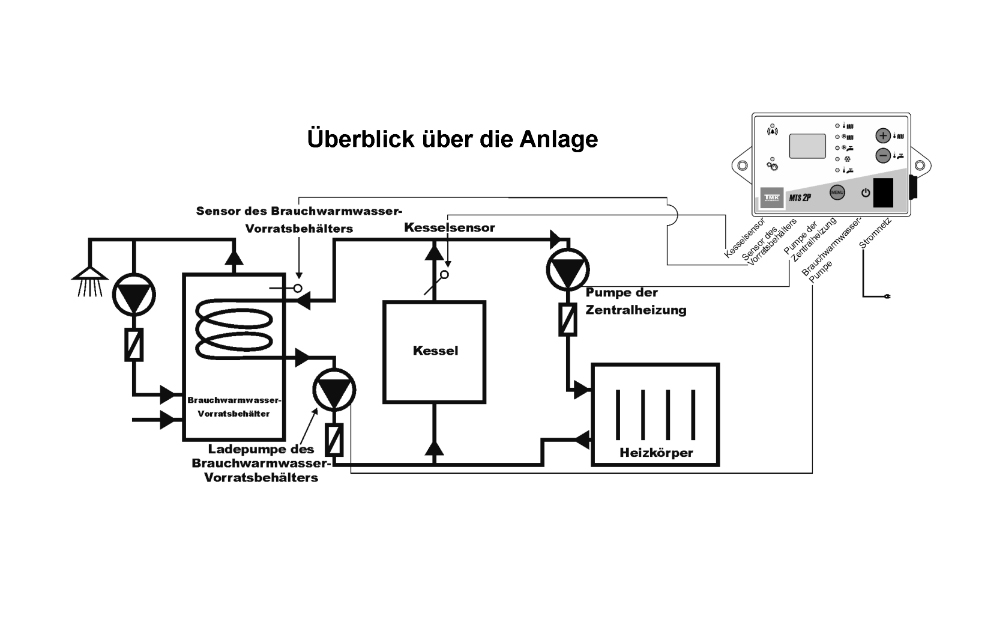 Der Regler ist für die Steuerung von zwei Pumpen geeignet: Umwälzpumpe für Zentralheizungsanlage und Ladepumpe für den Brauchwarmwasser-Vorratsbehälter. Der Regler kann vorrangig das Brauchwarmwasser bereiten und schützt zusätzlich den Vorratsbehälter und die Heizkörper vor Auskühlung durch einen zu kalten Kessel. MTS 2P arbeitet im SOMMER- oder WINTER-Betrieb. Der Regler verteilt die Kesselleistung dynamisch zwischen zwei Kreisläufe, wobei die Einstellungen und Präferenzen des Benutzers mit berücksichtigt werden. Im Ergebnis wird die Brauchwassertemperatur und die Temperatur der beheizten Räume auf einem optimalen Niveau gehalten.